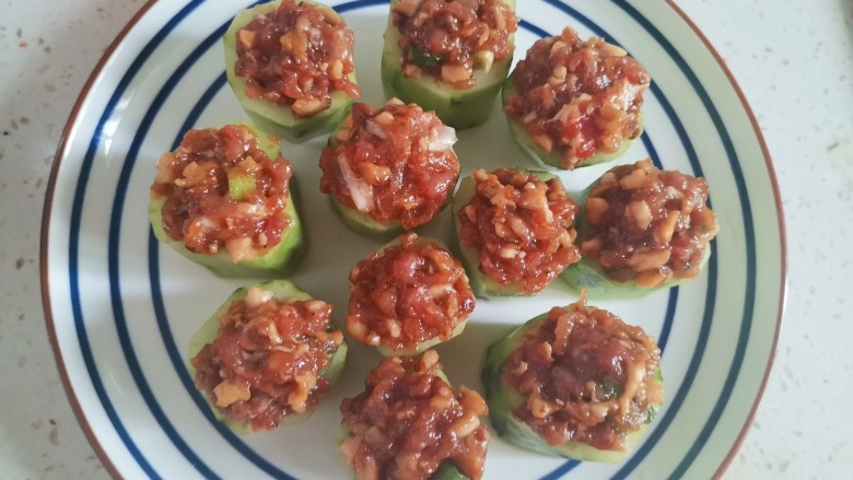 15. 上面放入小米辣装饰,黄瓜酿肉就做好了