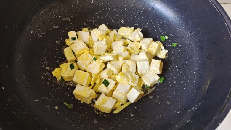 12. 放入煎好的鸡蛋豆腐块翻炒片刻
