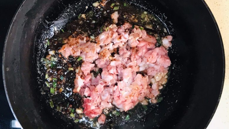 9. 加入瘦肉,加盐调味,撒入包子饺子调味料