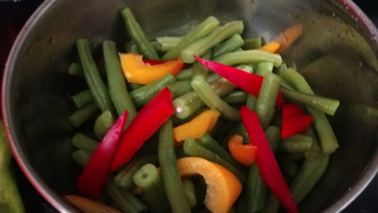 5. 倒入豆角。