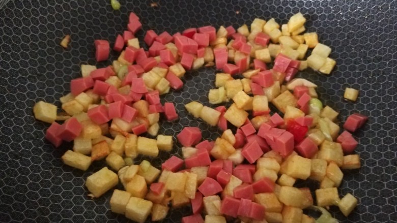 19. 再加入豌豆,胡萝卜,香菇,青椒丁进行翻炒两分钟