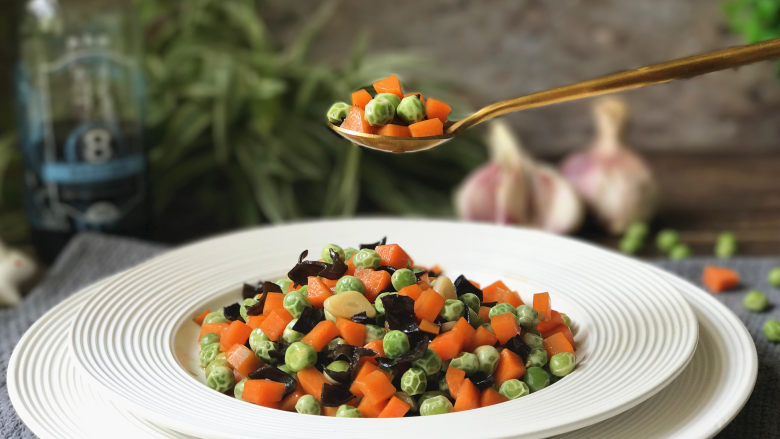 8. 放入豌豆、木耳和胡萝卜,翻炒均匀