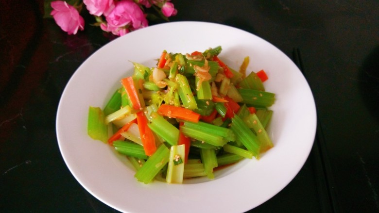 6. 把芹菜倒入锅中加入适量盐焯一下水马上捞出来。