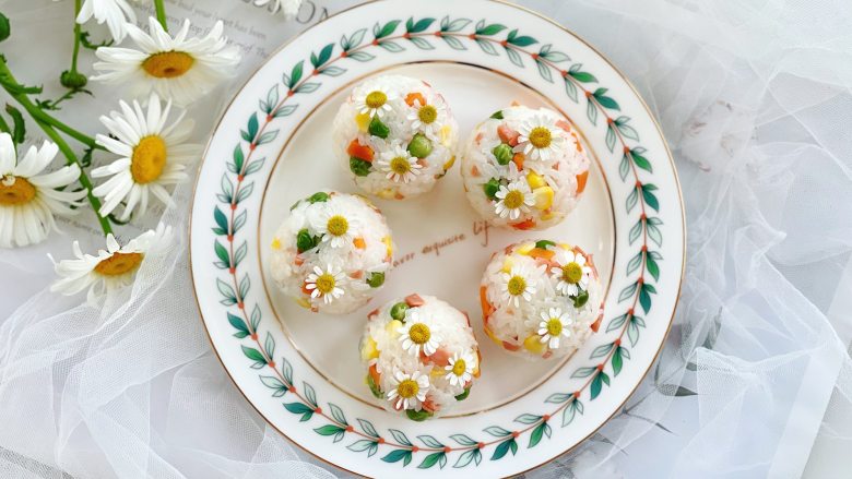 饭团的做法简单,携带方便,无论是作为早餐还是当作午餐便当都很合适,外出郊游更是首选,在饭团上点缀几朵洋甘菊,白色的条形小花瓣围着黄色的花蕾,像极了可爱的笑容,让饭团看起来来既清新又文艺。