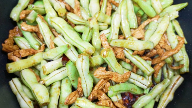 10. 下入肉豆角翻炒均匀。