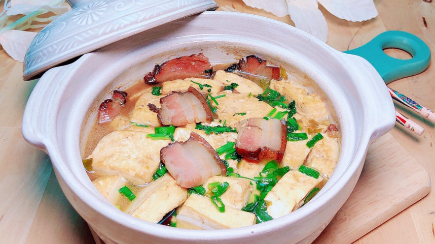 6. 将豆腐切厚片放入砂锅中,再放入腊肉。