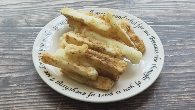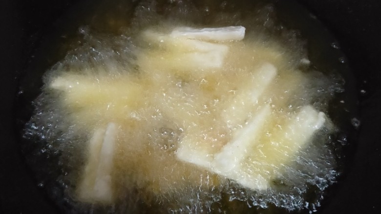 4. 锅中热油再倒入山药下去,炸至表面呈金黄色