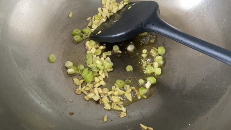 9. 下姜末蒜末小火煸香后,下葱白煸香
