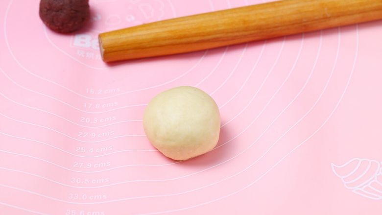 7. 利用面团松弛的时间将豆沙馅也分成均匀的12份滚圆,取一个面团按压成饼皮状,中间放一个豆沙球。