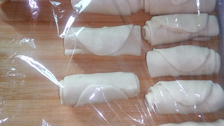 8. 面卷压扁,擀饼皮,包入玫瑰苹果酱。