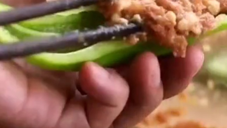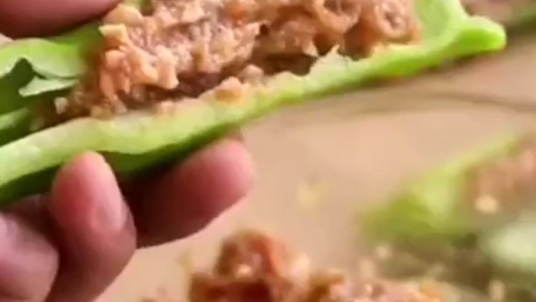 10. 把肉馅装入尖椒。