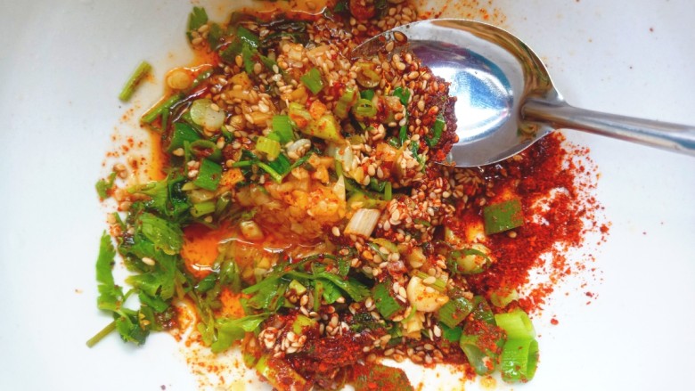 4. 取碗放入蒜末,芝麻,辣面,香葱香菜,