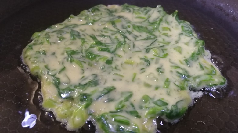 11. 平底锅倒入适量玉米油,舀一勺面糊。