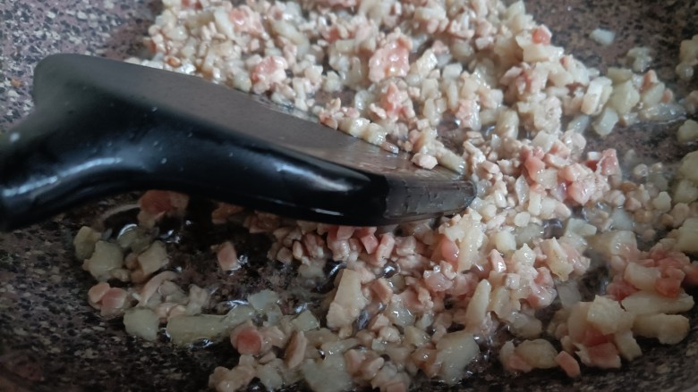 7. 猪肉也切成丁。这里最好是三肥七瘦,不要全放瘦肉,吃起来不香,口感也不太好,一定要加点肥肉才好吃