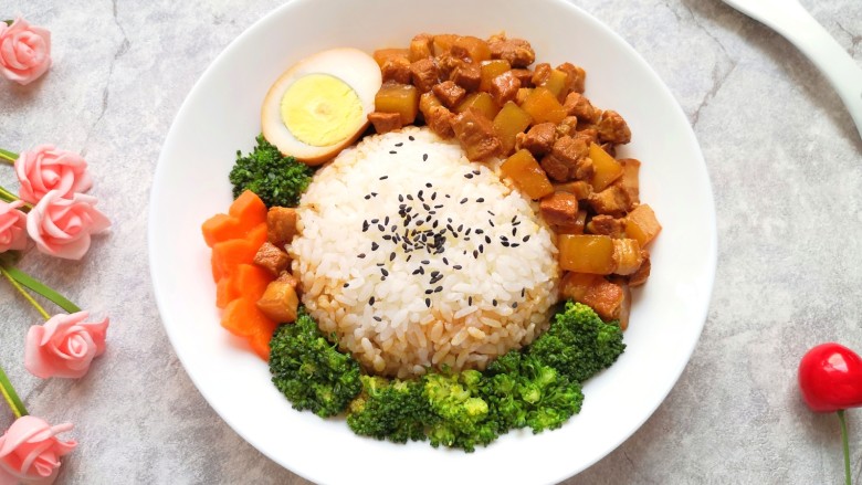 16. 将蒸好的米饭装在小碗里,倒扣在盘子里撒上黑芝麻,卤蛋切开摆在边上,再摆上焯好的西兰花和胡萝卜,最后浇上卤肉土豆块。