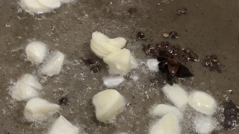 4. 热锅下油,放入蒜片和八角花椒炒香。(喜欢吃辣的朋友可以放一些辣椒)