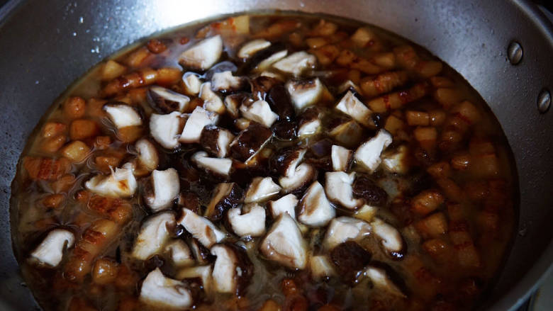 14. 时间到,加入炸过的洋葱丁,焯过水的香菇丁。