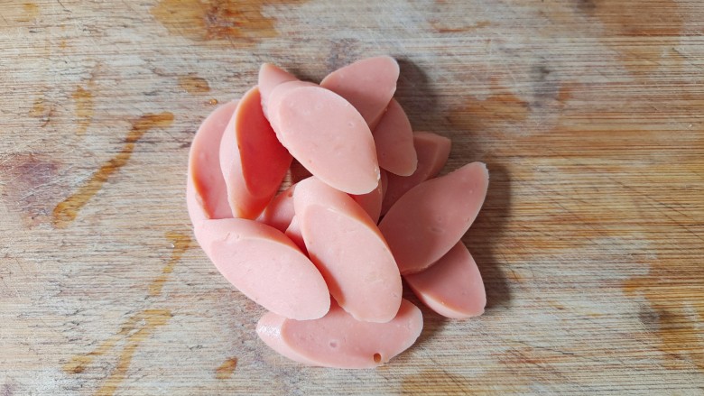 6. 炒锅中加入适量花生油烧热,放入葱姜爆香,加入火腿肠片翻炒片刻