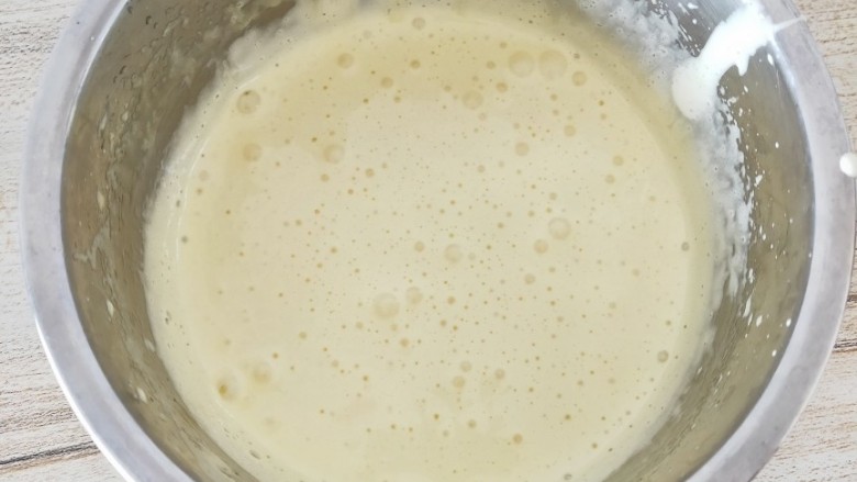 4. 牛奶低温加热至冒泡泡,将牛奶分次倒入蛋黄糊中