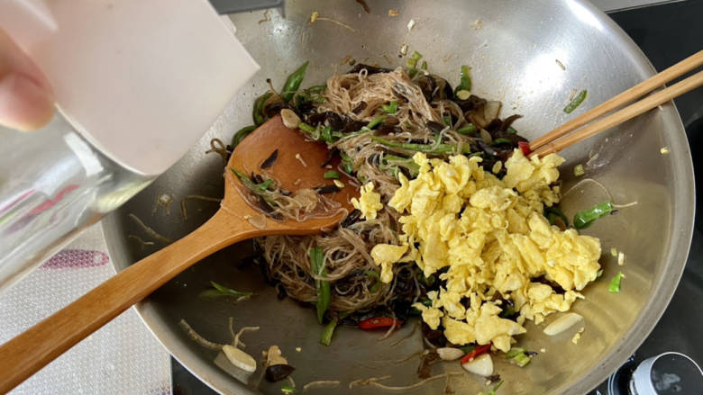12. 下木耳粗丝和粉丝,中火翻炒均匀