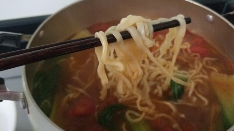 14. 翻炒一会盖上盖子将西红柿焖出汤汁后即可关火