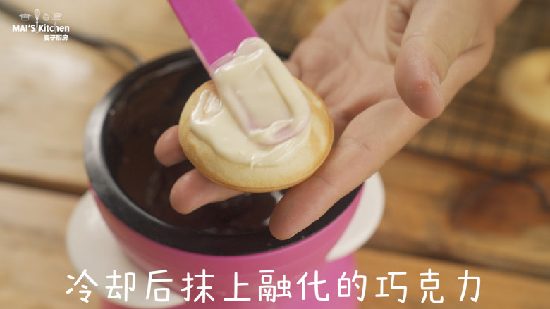 7. 待甜甜圈冷却后上层抹上融化的巧克力。