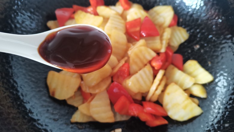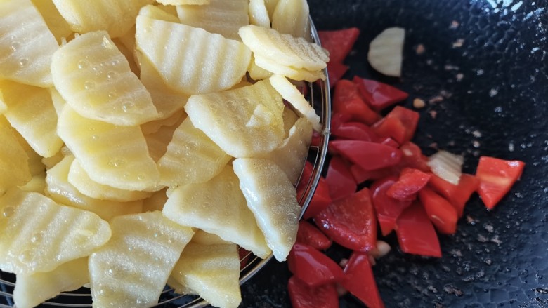 10. 锅留余油放入蒜末炒出香味,放入红椒翻炒片刻