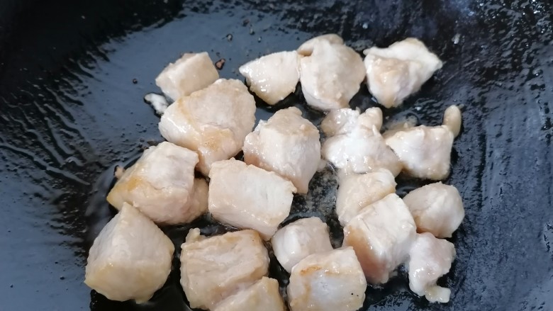 7. 锅内放油烧热放入鸡胸肉翻炒