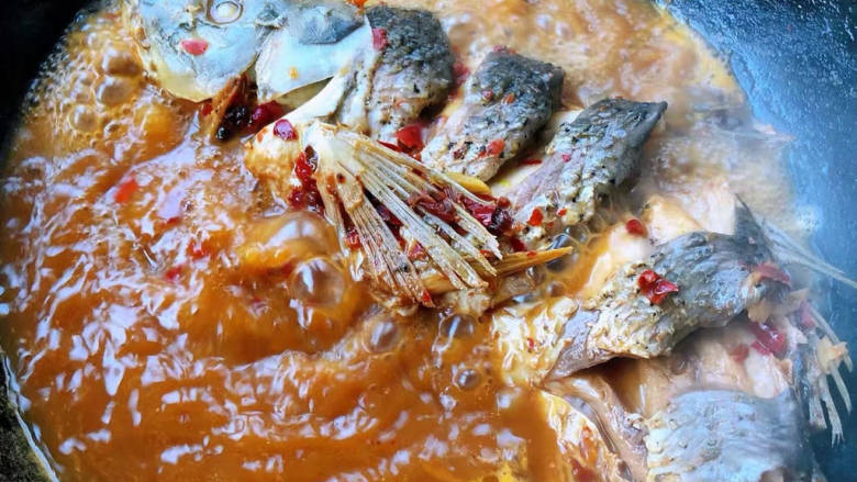 11. 炖至鲤鱼完全熟透改成小火放入盐和味精改小火慢炖至入味即可出锅享用
