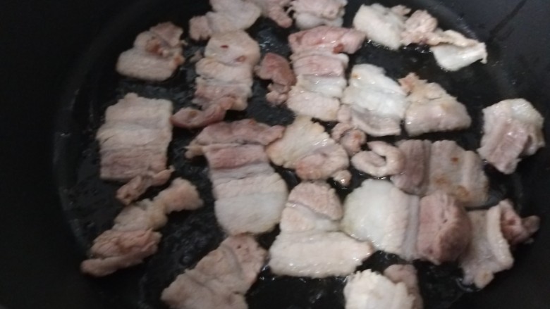8. 锅中倒入少许油倒入五花肉煸炒。