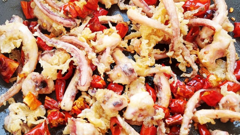 10. 加入炸好的鱿鱼须一起翻炒。