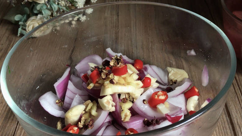 9. 腌制好的洋葱里,加入姜蒜末、小米辣和花椒粒