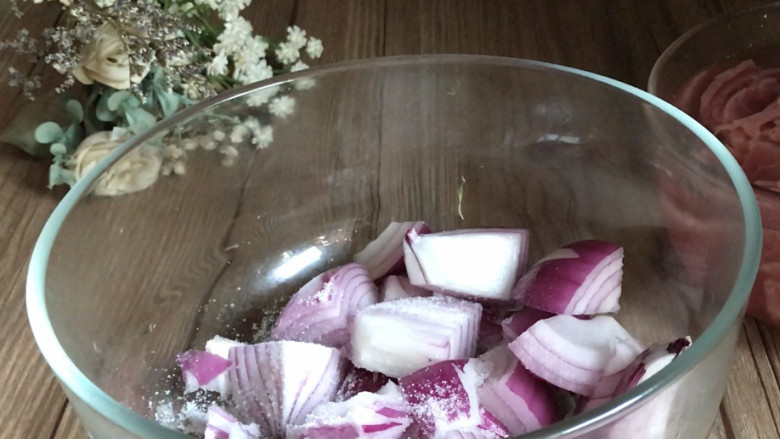 3. 洋葱剥去外皮,洗净切小块,加盐腌制一会儿