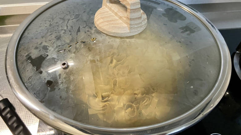 4. 坐锅烧水,水开下千张,加少许料酒,煮两分钟,捞出备用