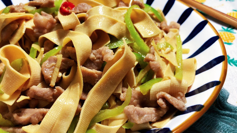 千张是我们中国特有的一种豆制品,是一种薄的豆腐干片,色米黄。由于其在特质工具内层层压制,出品时候看起来有千百张叠加在一而称为千张,在中国北方某些地方称为干豆腐。 千张的叫法常见于苏北、赣、皖、鄂地区,苏北个别地区称为百叶,有异曲同工之妙。千张口感柔韧豆香浓郁营养丰富,无论是水煮,烧炖,清炒,烫菜、凉拌都很好吃。今天阿晨就做一个简单的千张炒肉丝,千张柔韧,肉丝滑嫩,咸鲜味美,营养又下饭,感兴趣的小伙伴一起来看看吧😄