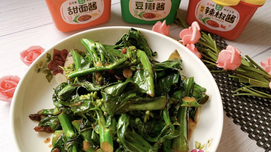7. 而后加入菜心叶翻炒