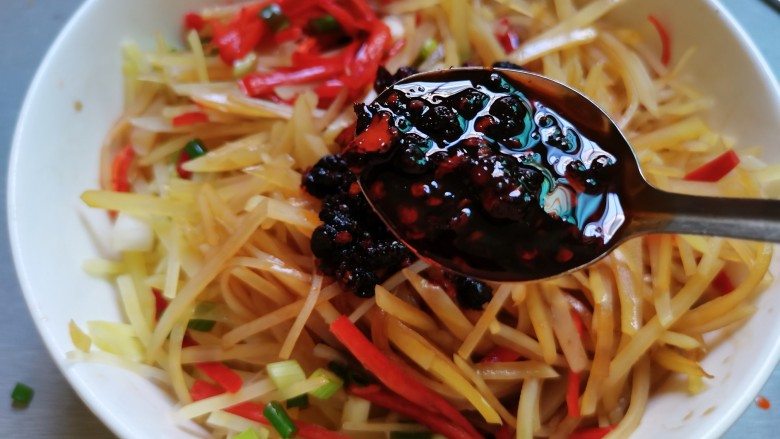 “老干妈拌土豆丝”超级好吃,辣味十足,酸味可口,很下饭的一道菜