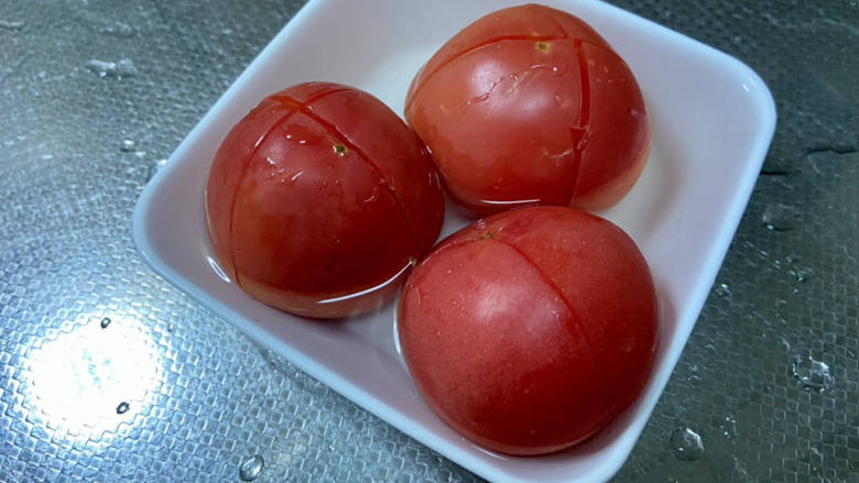 2. 番茄清洗表面划十字花刀,开水浸泡三分钟,方便去皮