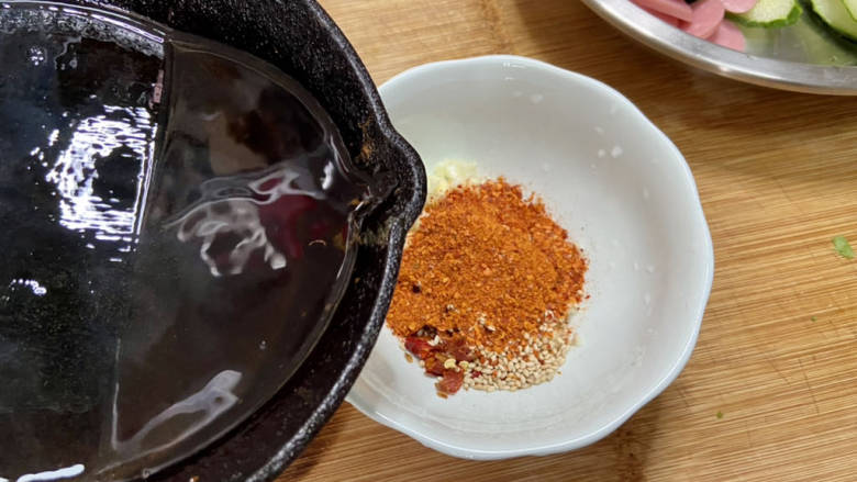 7. 八成热的热油,分次浇在辣椒粉上,激发香味