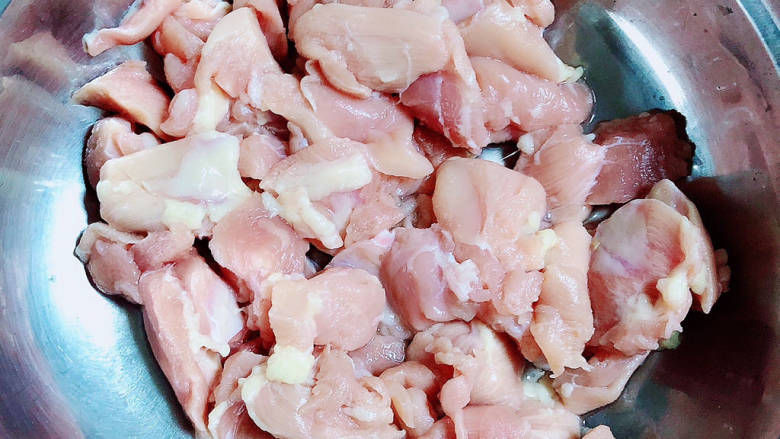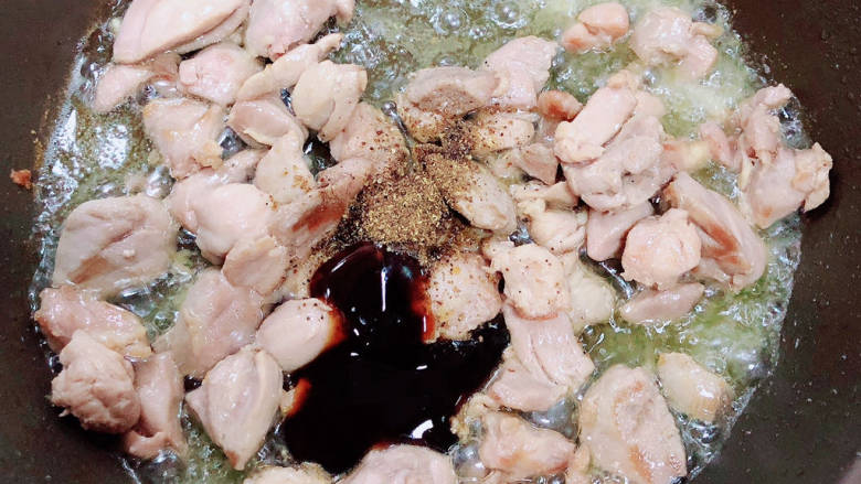 4. 锅中倒入油,加入至五成热,放入鸡块,翻炒均匀。