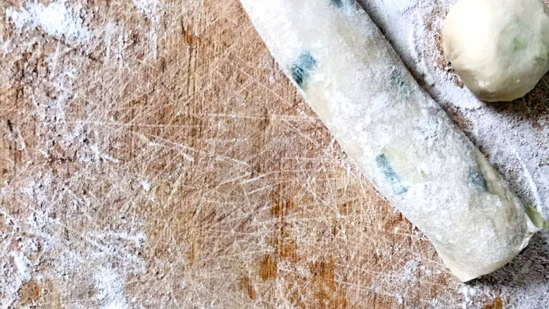 1. 将手抓饼卷成上图样,然后切成长约2-3厘米的小剂子样,然后用擀面杖讲小剂子擀平成小圆饼