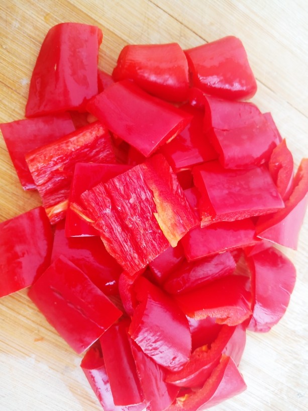 9. 加入青红椒块和料汁再炖煮2分钟。