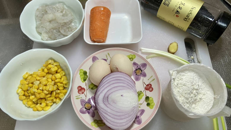 2. 虾仁去虾线洗净,胡萝卜削皮洗净,洋葱去外皮洗净,姜搓洗干净,小葱择好洗净,玉米粒清洗备用