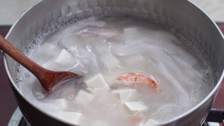 5. 锅中重新添水烧沸,将豆腐和虾仁一起放进去煮两分钟。