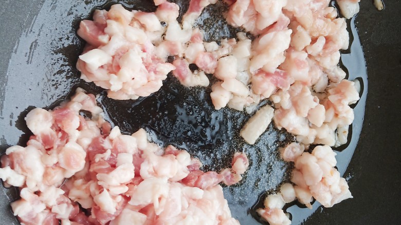 10. 锅中放5克食用油,加入五花肉煸炒出油脂。