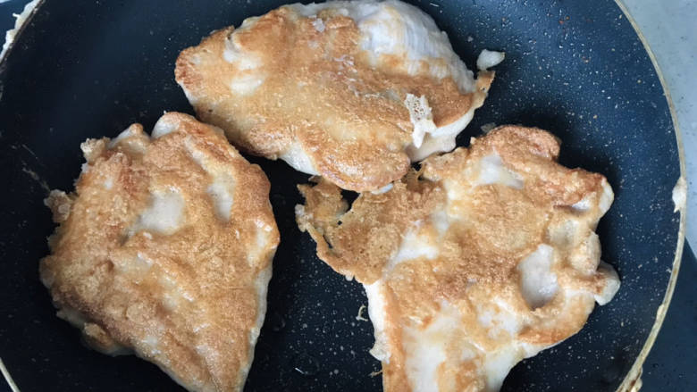 6. 煎锅里倒入适量食用油,放入鸡胸,中小火煎;