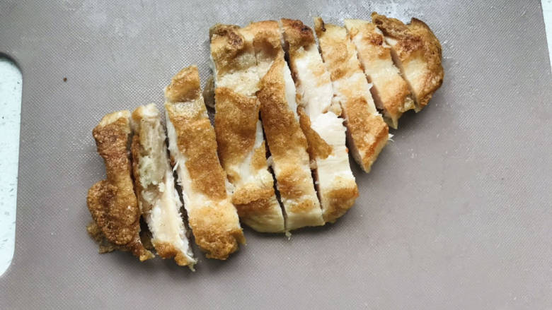 11. 4-5分钟煎好的鸡胸,晾一会儿,在熟食板上切成条;
