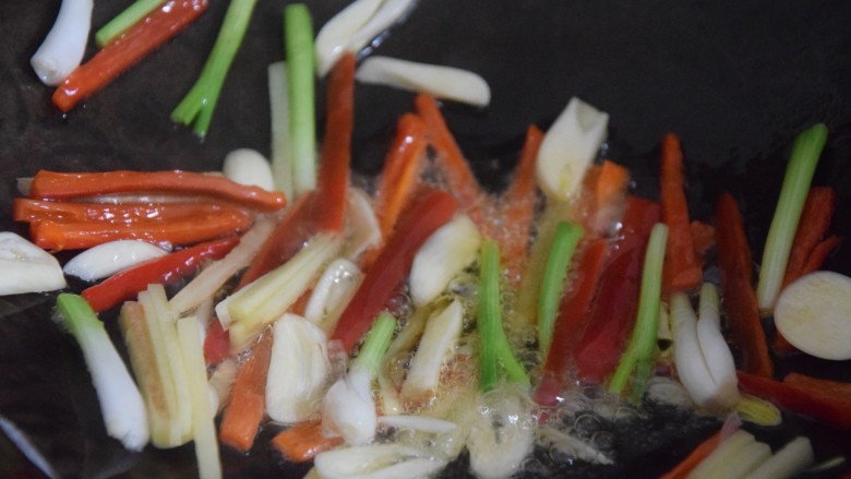 7. 起锅热油,倒入葱姜蒜辣椒炒出香味