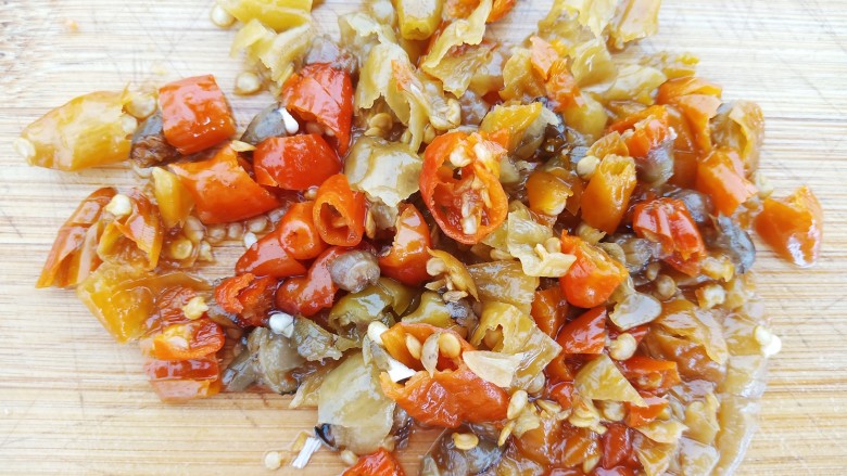 11. 锅中放10毫升食用油,加入泡椒泡豇豆和姜蒜爆香。