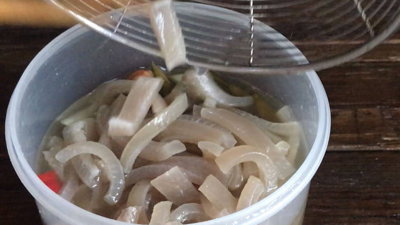 17. 再捞出沥干水分,放入装有泡椒的保鲜盒中,拌匀后密封,夏天放入冰箱冷藏一天